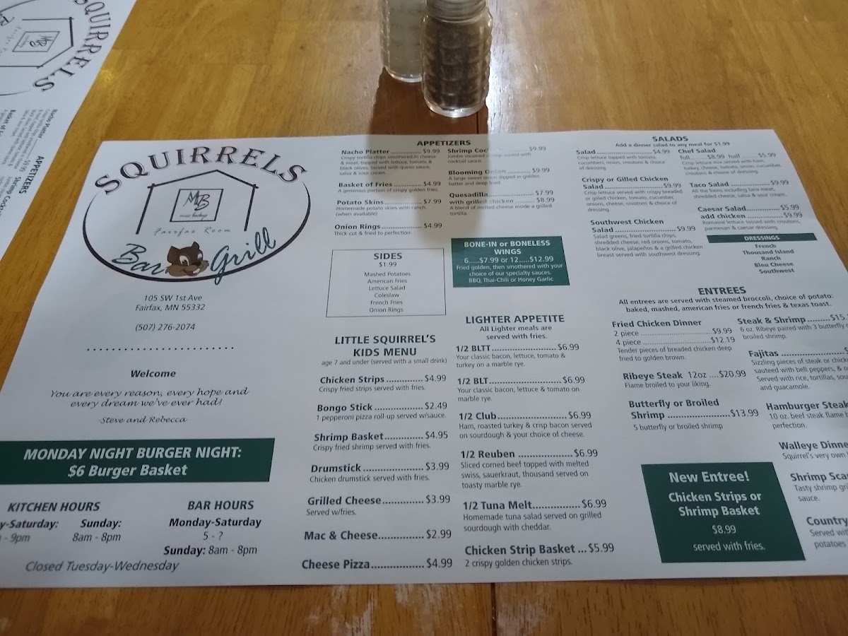 Welcome to Squirrels Bar & Grill, a delightful gem nestled in the heart of Fairfax, Minnesota, at 105 1st Ave SW. This charming establishment invites you to savor an array of culinary delights that will undoubtedly leave a lasting impression.
